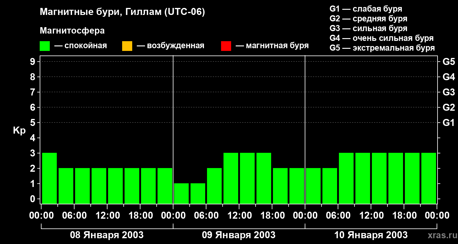 Изменения геомагнитного индекса Kp с 8 по 10 января 2003 года для средних широт