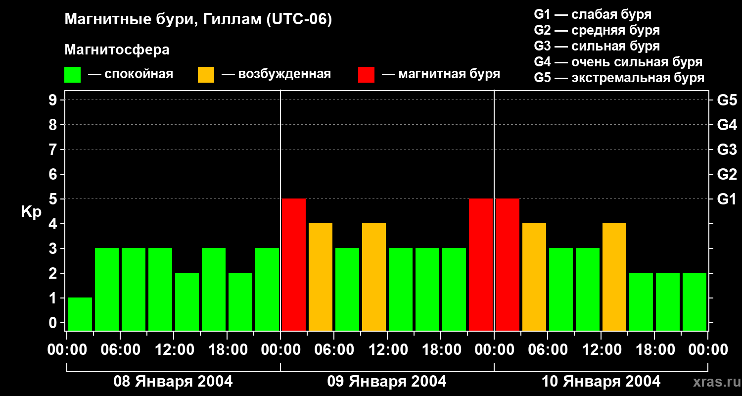 Изменения геомагнитного индекса Kp с 8 по 10 января 2004 года для средних широт