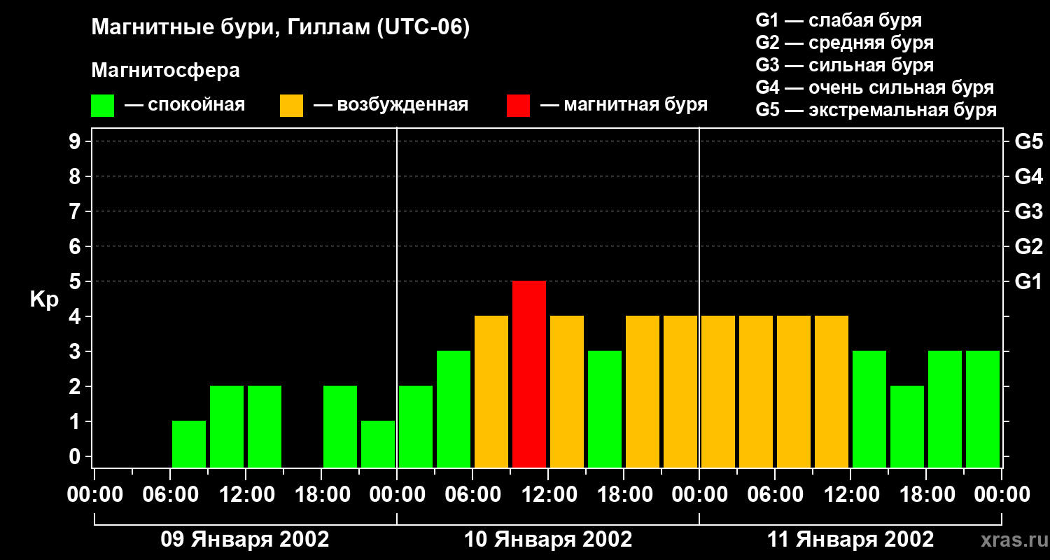 Изменения геомагнитного индекса Kp с 9 по 11 января 2002 года для средних широт
