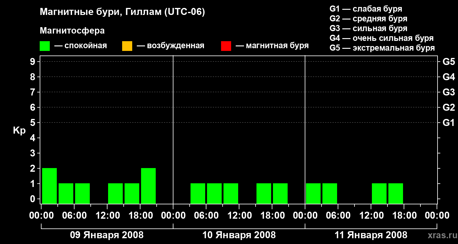 Изменения геомагнитного индекса Kp с 9 по 11 января 2008 года для средних широт