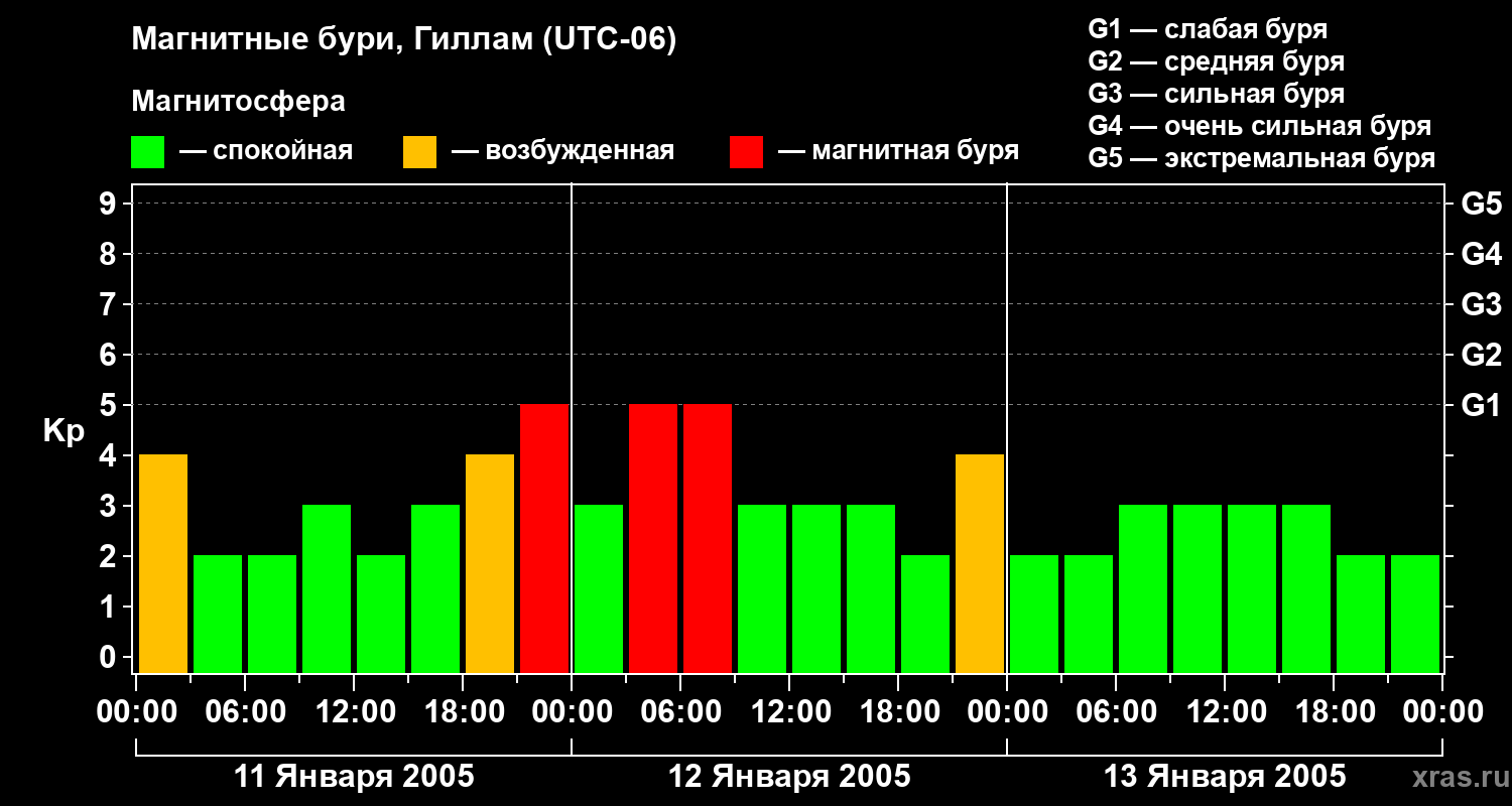 Изменения геомагнитного индекса Kp с 11 по 13 января 2005 года для средних широт