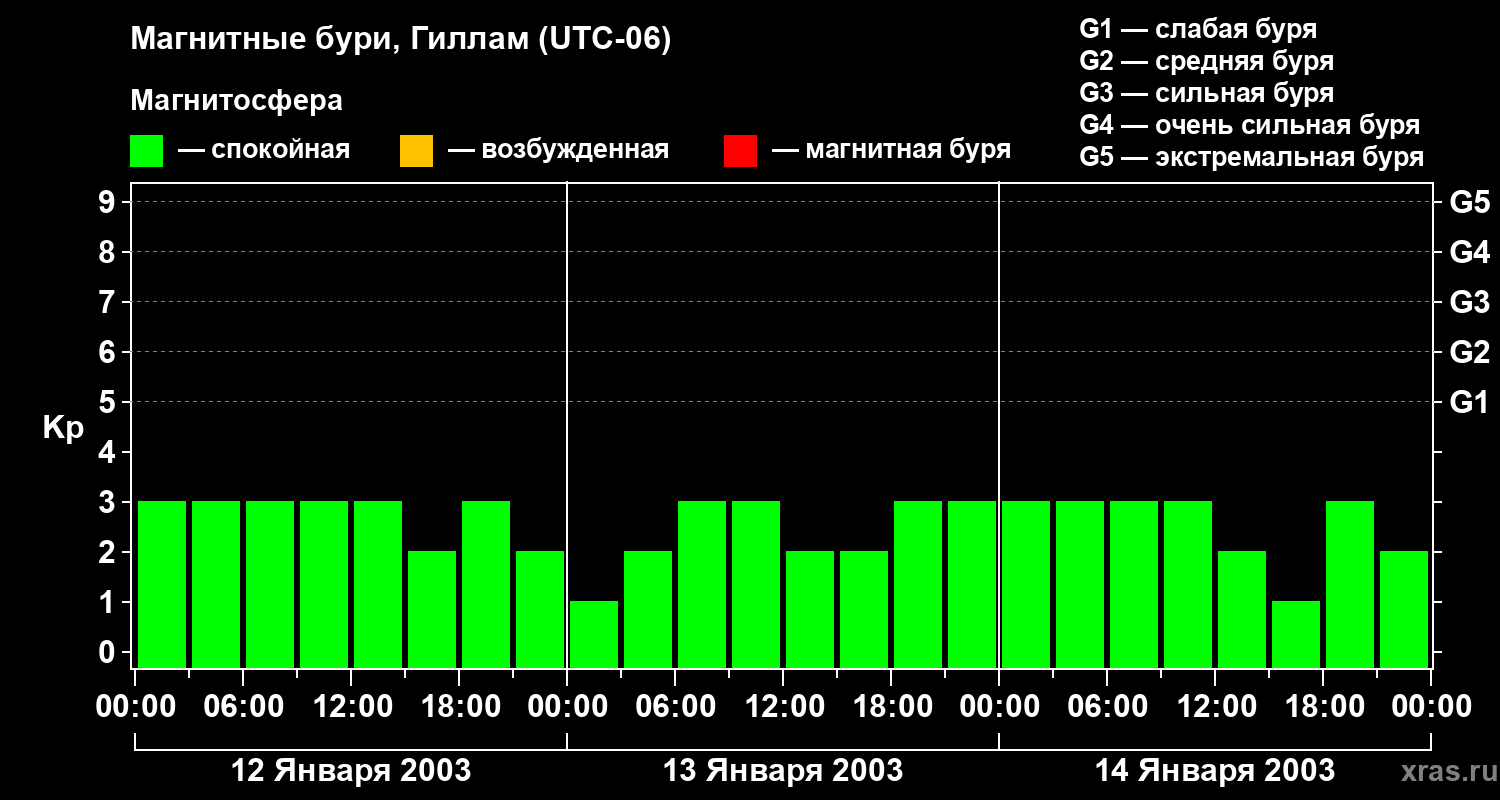 Изменения геомагнитного индекса Kp с 12 по 14 января 2003 года для средних широт