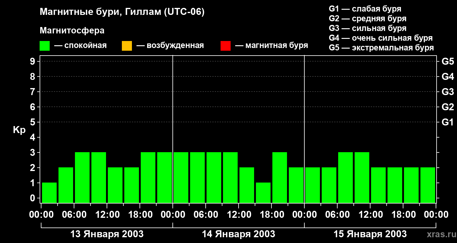 Изменения геомагнитного индекса Kp с 13 по 15 января 2003 года для средних широт