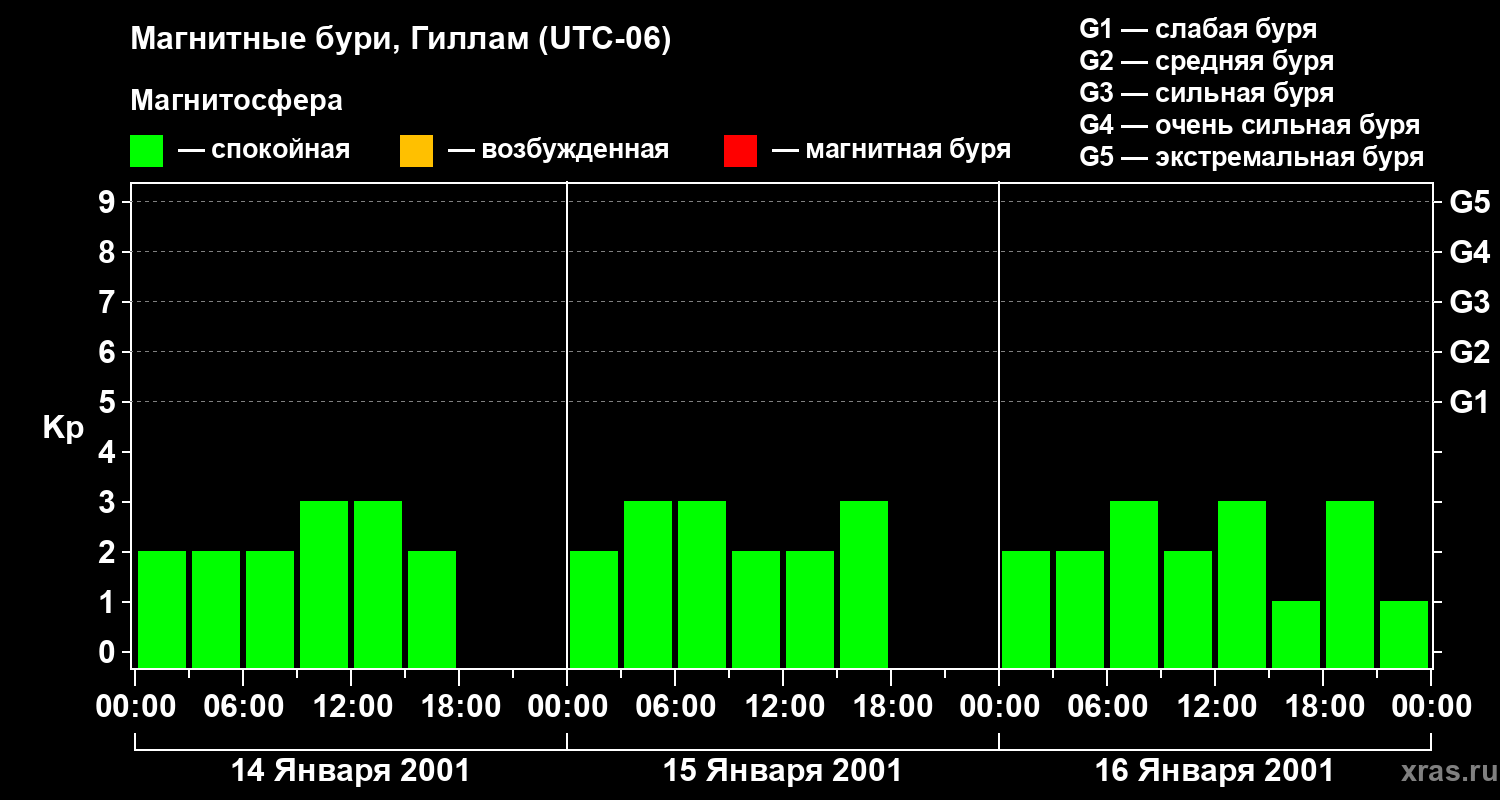 Изменения геомагнитного индекса Kp с 14 по 16 января 2001 года для средних широт