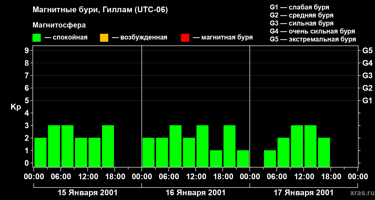 Изменения геомагнитного индекса Kp с 15 по 17 января 2001 года для средних широт