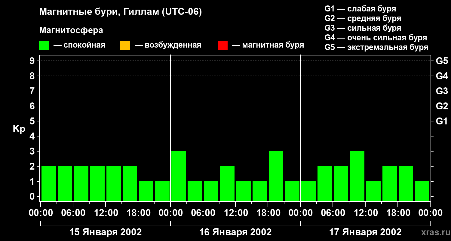 Изменения геомагнитного индекса Kp с 15 по 17 января 2002 года для средних широт