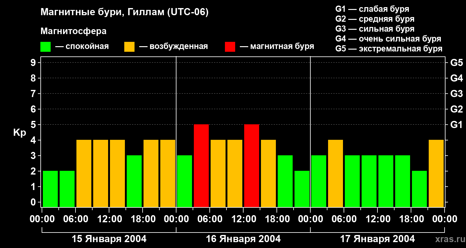 Изменения геомагнитного индекса Kp с 15 по 17 января 2004 года для средних широт