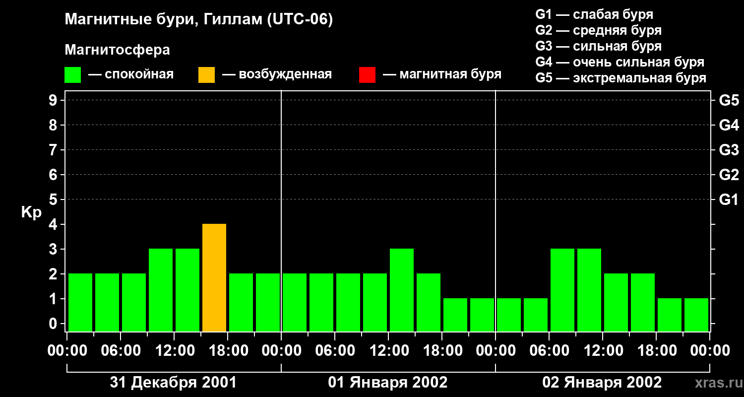 Изменения геомагнитного индекса Kp с 31 декабря 2001 года по 2 января 2002 года для средних широт