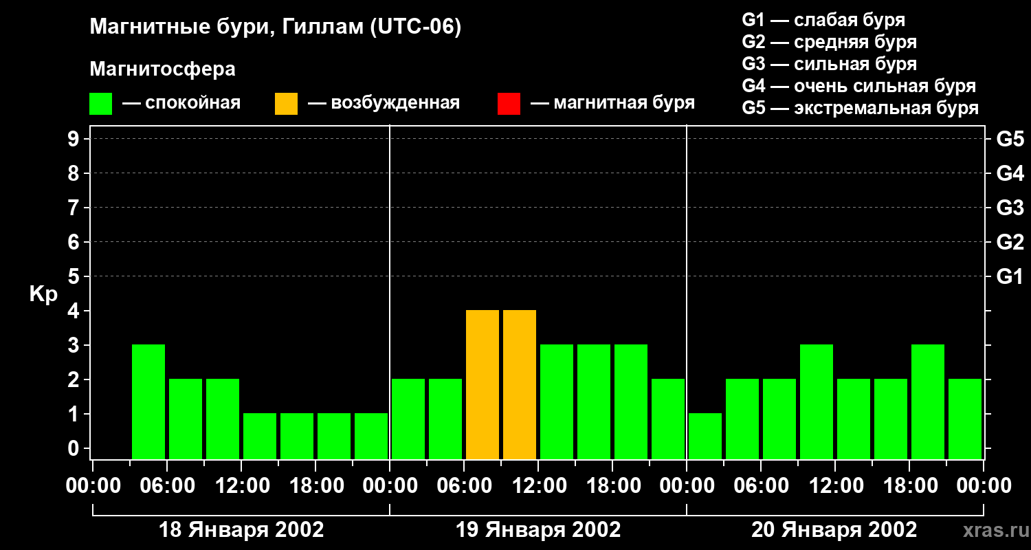 Изменения геомагнитного индекса Kp с 18 по 20 января 2002 года для средних широт