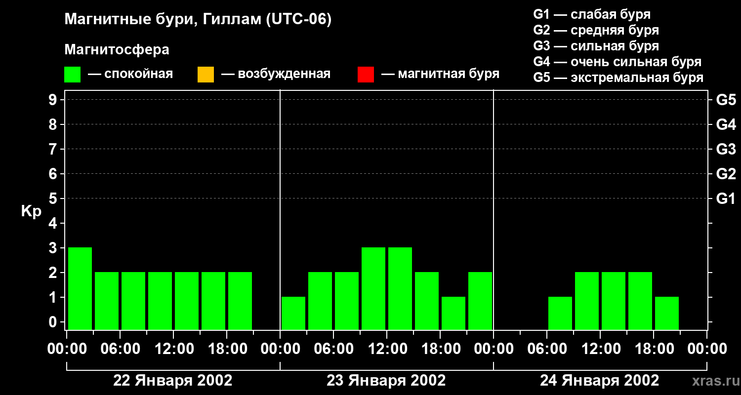 Изменения геомагнитного индекса Kp с 22 по 24 января 2002 года для средних широт