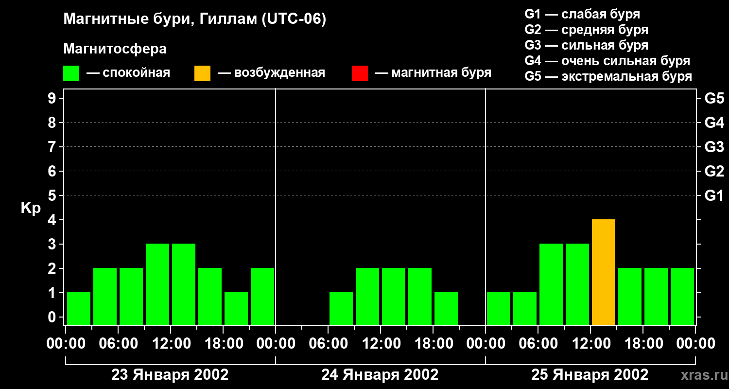 Изменения геомагнитного индекса Kp с 23 по 25 января 2002 года для средних широт