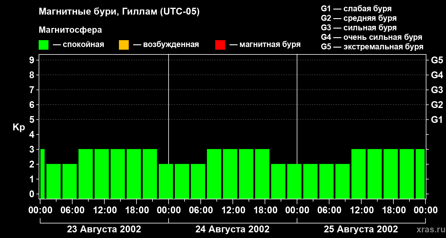 Изменения геомагнитного индекса Kp с 23 по 25 августа 2002 года для средних широт
