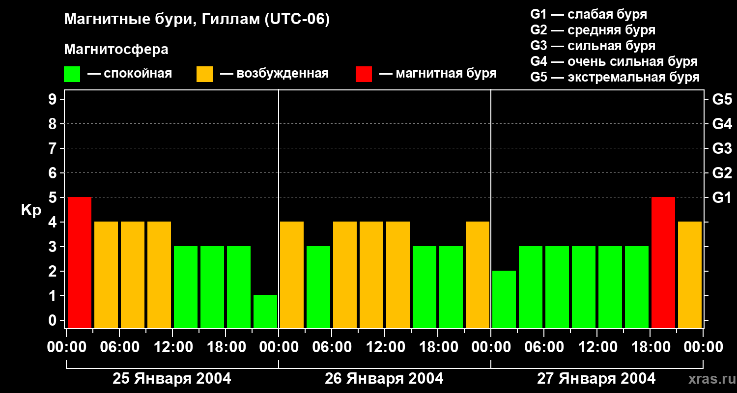 Изменения геомагнитного индекса Kp с 25 по 27 января 2004 года для средних широт