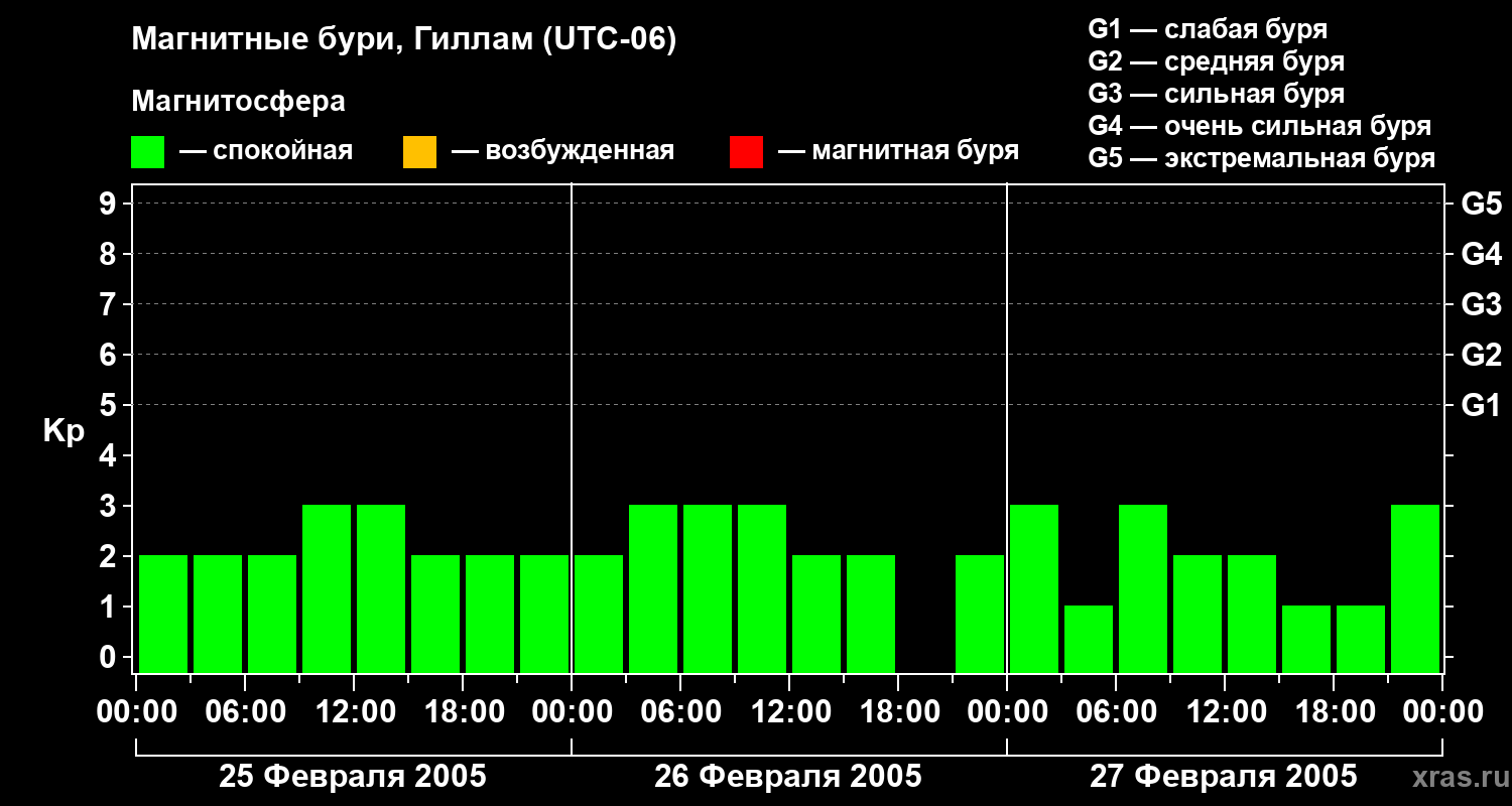 Изменения геомагнитного индекса Kp с 25 по 27 февраля 2005 года для средних широт