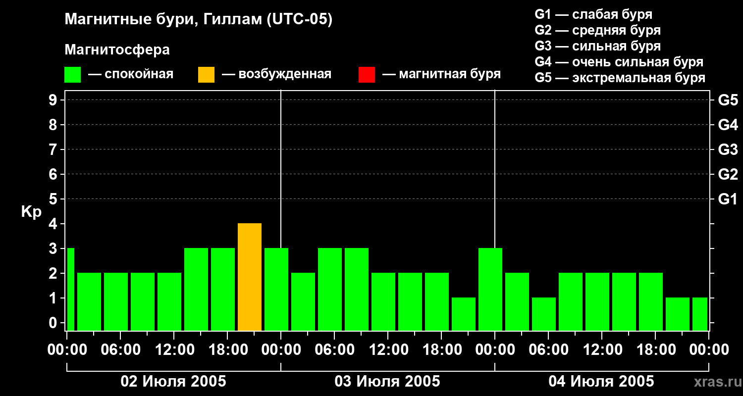 Изменения геомагнитного индекса Kp с 2 по 4 июля 2005 года для средних широт