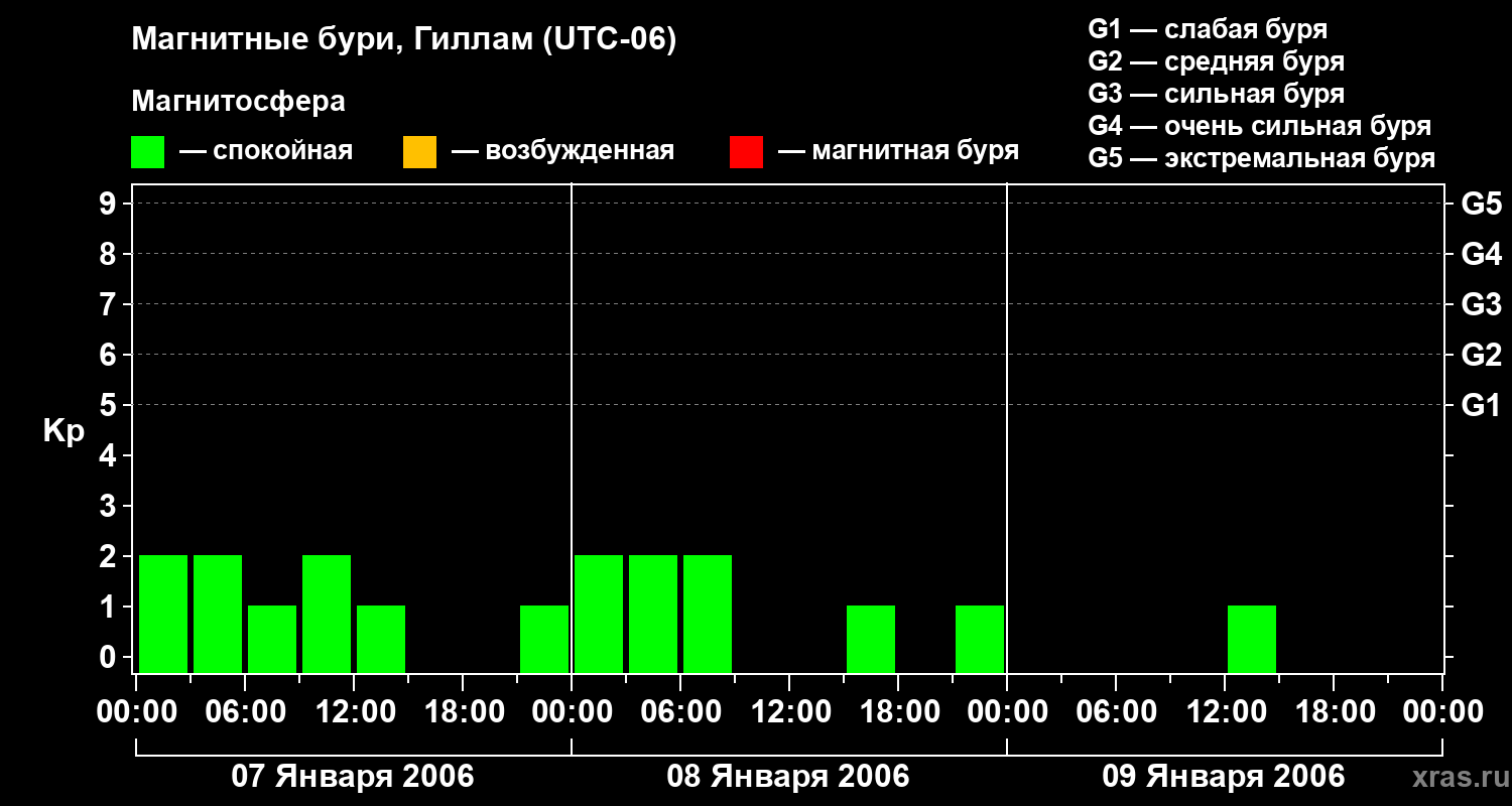 Изменения геомагнитного индекса Kp с 7 по 9 января 2006 года для средних широт