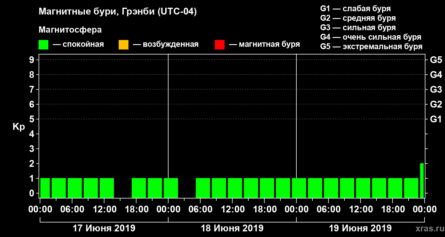 Изменения геомагнитного индекса Kp с 17 по 19 июня 2019 года для средних широт