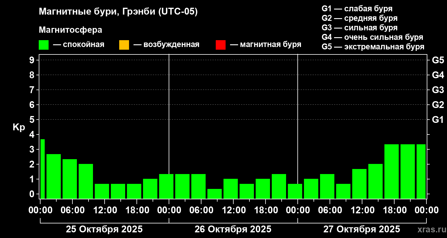 Изменения геомагнитного индекса Kp с 25 по 27 октября 2025 года для средних широт