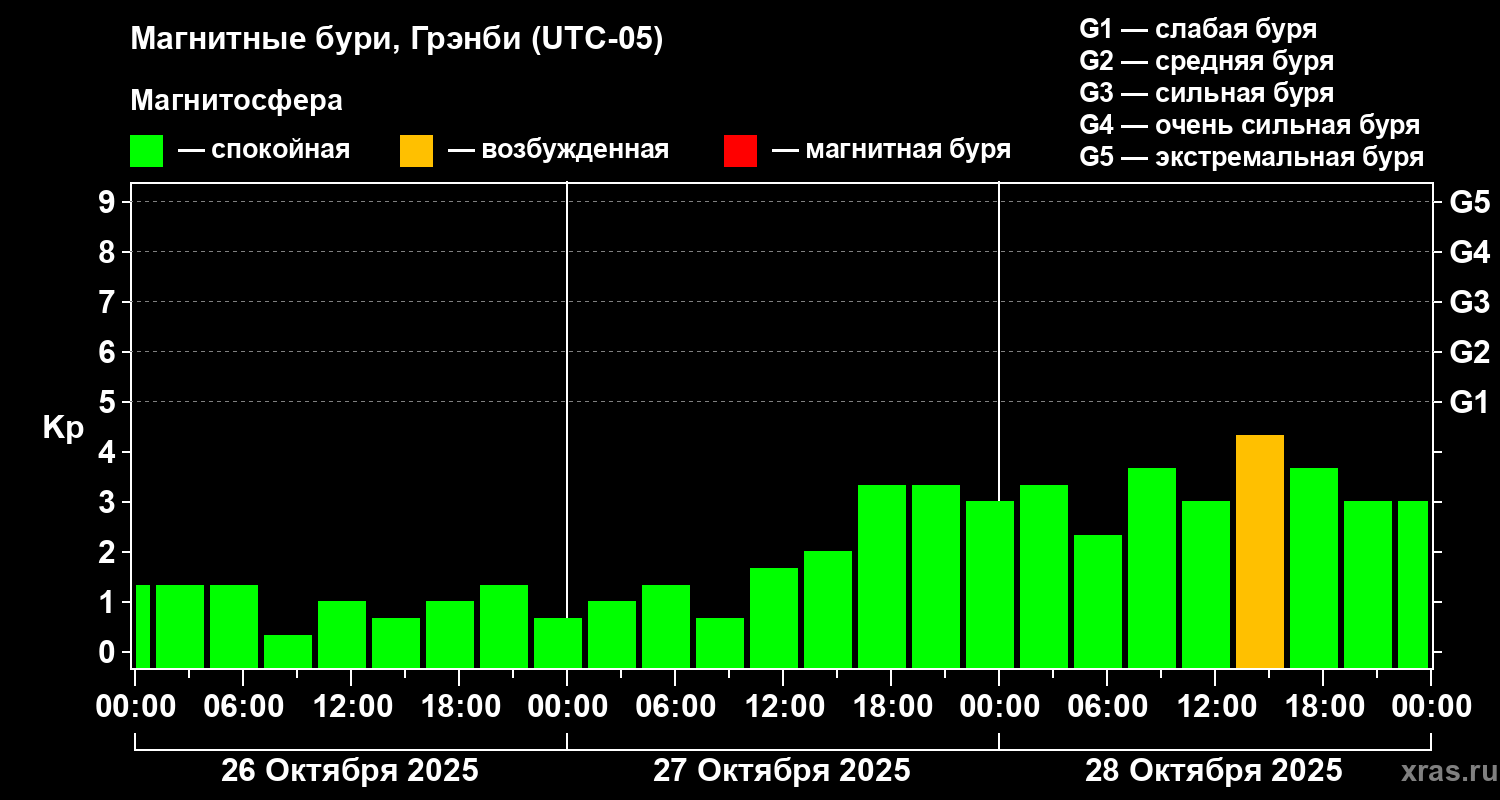 Изменения геомагнитного индекса Kp с 26 по 28 октября 2025 года для средних широт