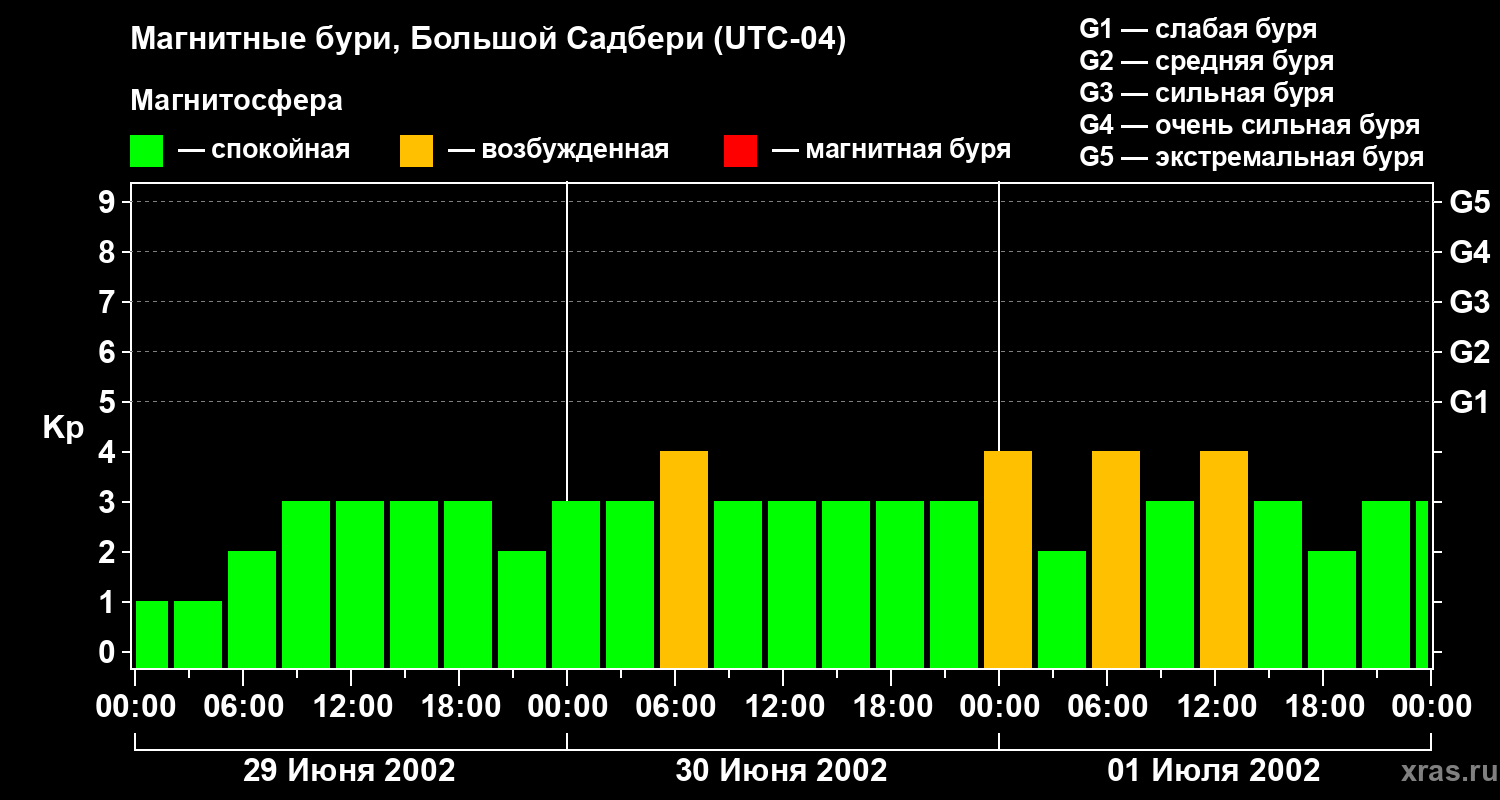 Изменения геомагнитного индекса Kp с 29 июня по 1 июля 2002 года для средних широт