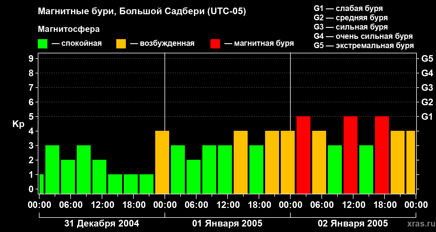 Изменения геомагнитного индекса Kp с 31 декабря 2004 года по 2 января 2005 года для средних широт