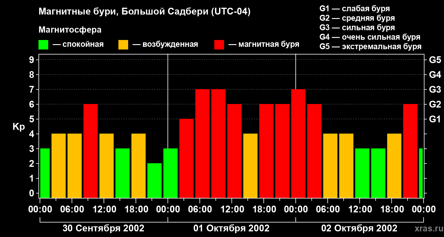 Изменения геомагнитного индекса Kp с 30 сентября по 2 октября 2002 года для средних широт