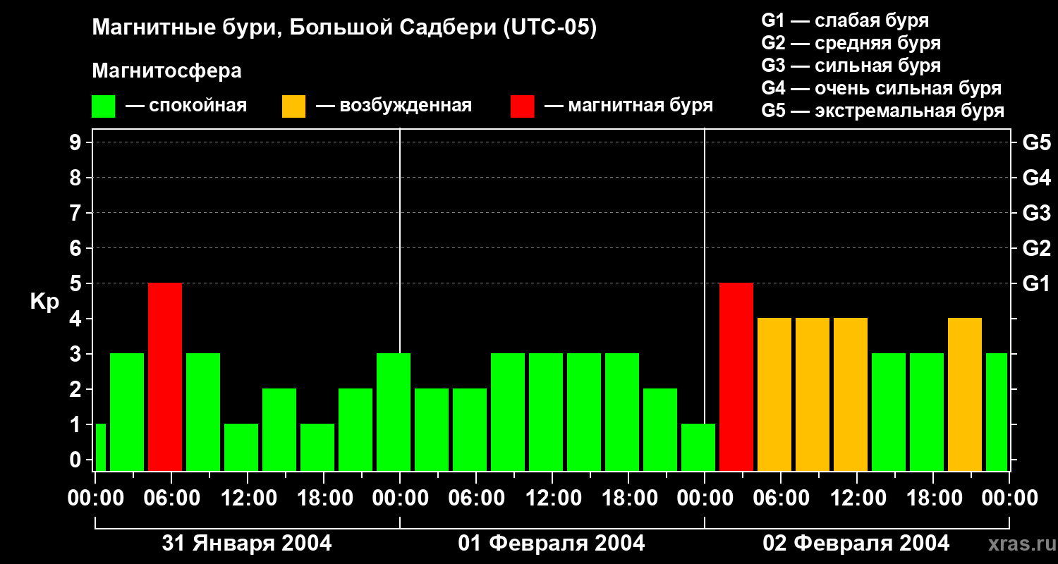 Изменения геомагнитного индекса Kp с 31 января по 2 февраля 2004 года для средних широт