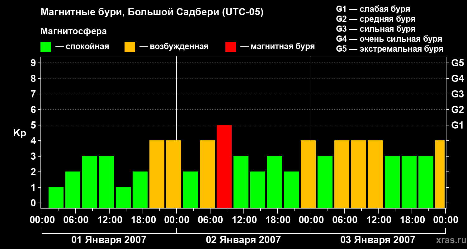 Изменения геомагнитного индекса Kp с 1 по 3 января 2007 года для средних широт