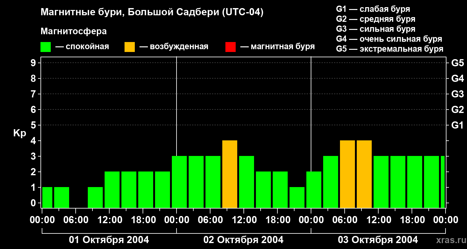 Изменения геомагнитного индекса Kp с 1 по 3 октября 2004 года для средних широт