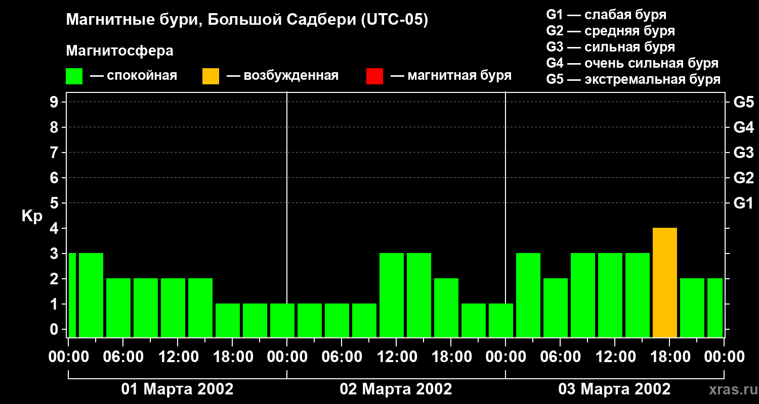 Изменения геомагнитного индекса Kp с 1 по 3 марта 2002 года для средних широт
