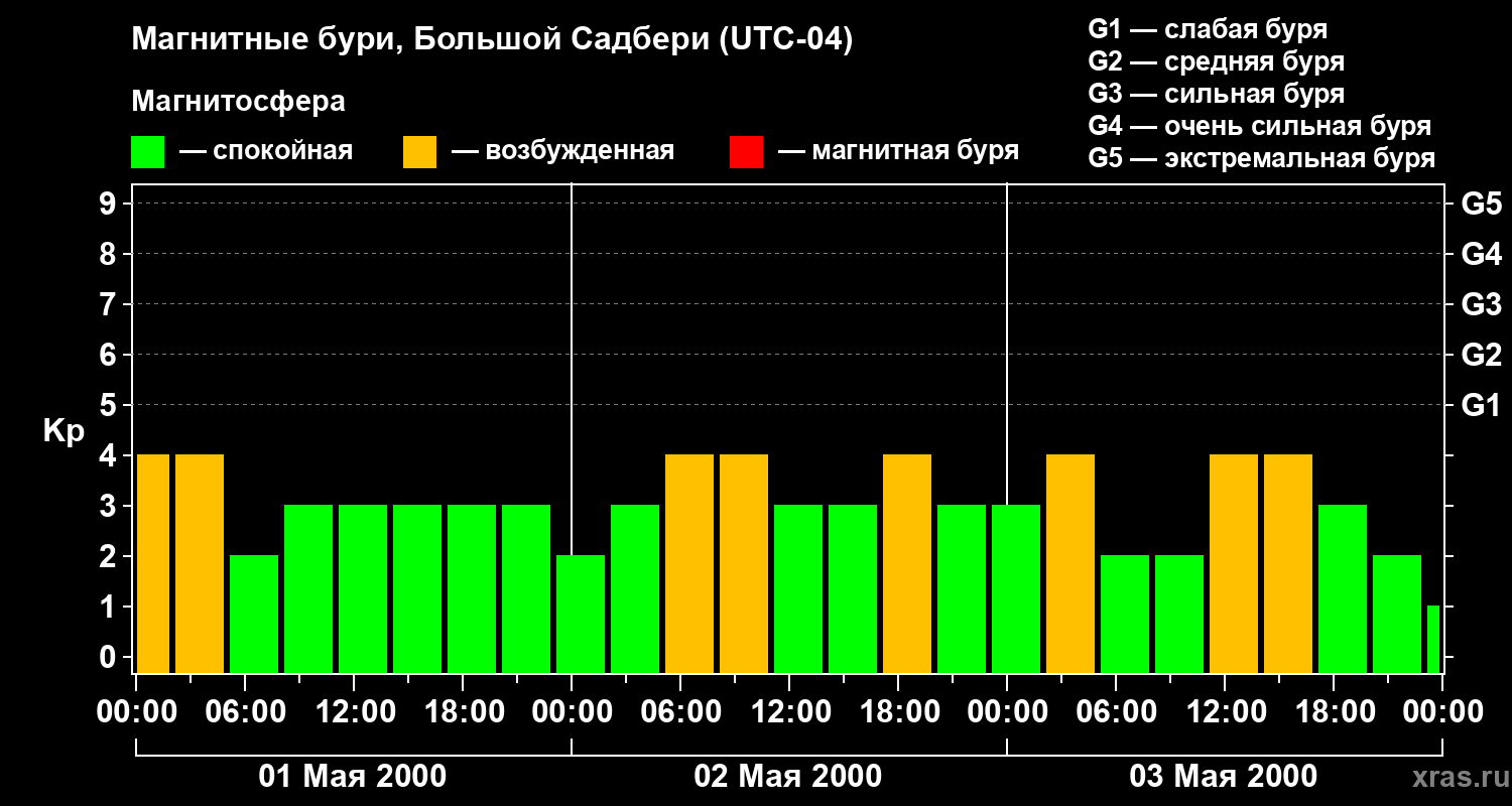 Изменения геомагнитного индекса Kp с 1 по 3 мая 2000 года для средних широт