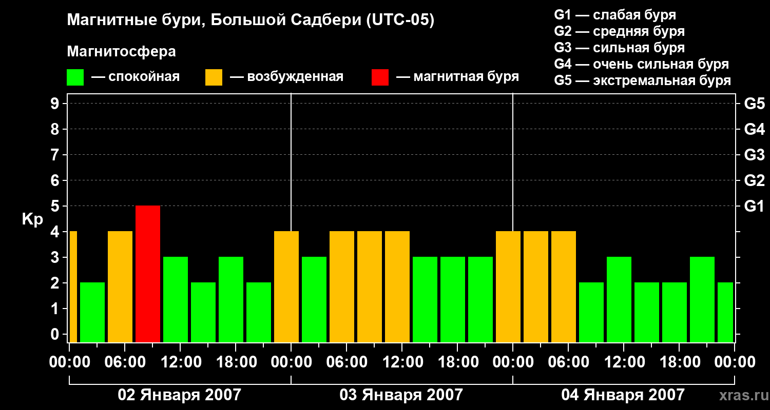 Изменения геомагнитного индекса Kp с 2 по 4 января 2007 года для средних широт