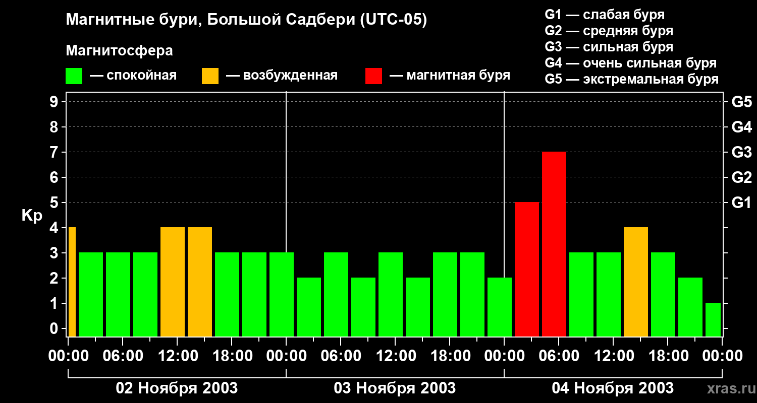 Изменения геомагнитного индекса Kp с 2 по 4 ноября 2003 года для средних широт