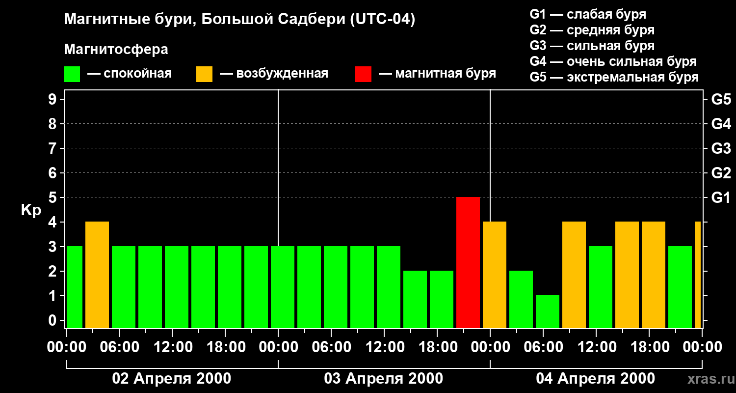 Изменения геомагнитного индекса Kp с 2 по 4 апреля 2000 года для средних широт