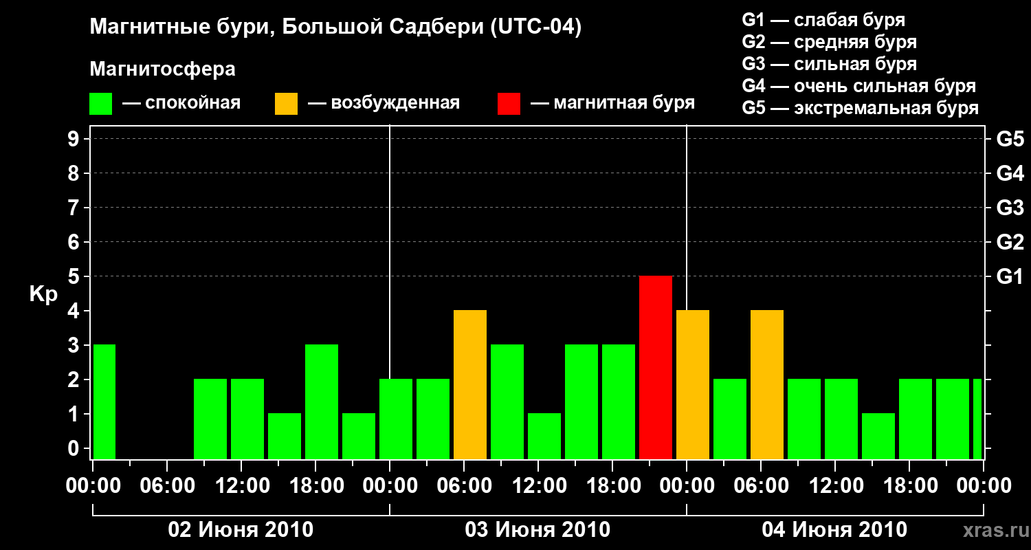 Изменения геомагнитного индекса Kp с 2 по 4 июня 2010 года для средних широт