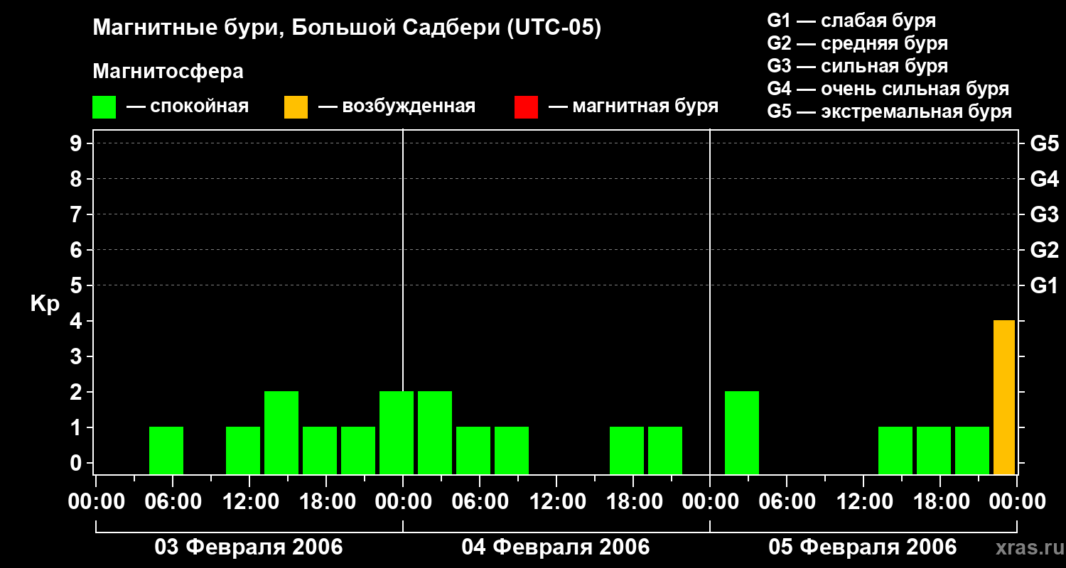 Изменения геомагнитного индекса Kp с 3 по 5 февраля 2006 года для средних широт