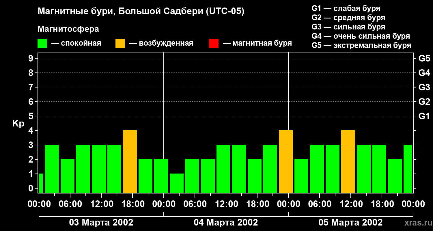 Изменения геомагнитного индекса Kp с 3 по 5 марта 2002 года для средних широт