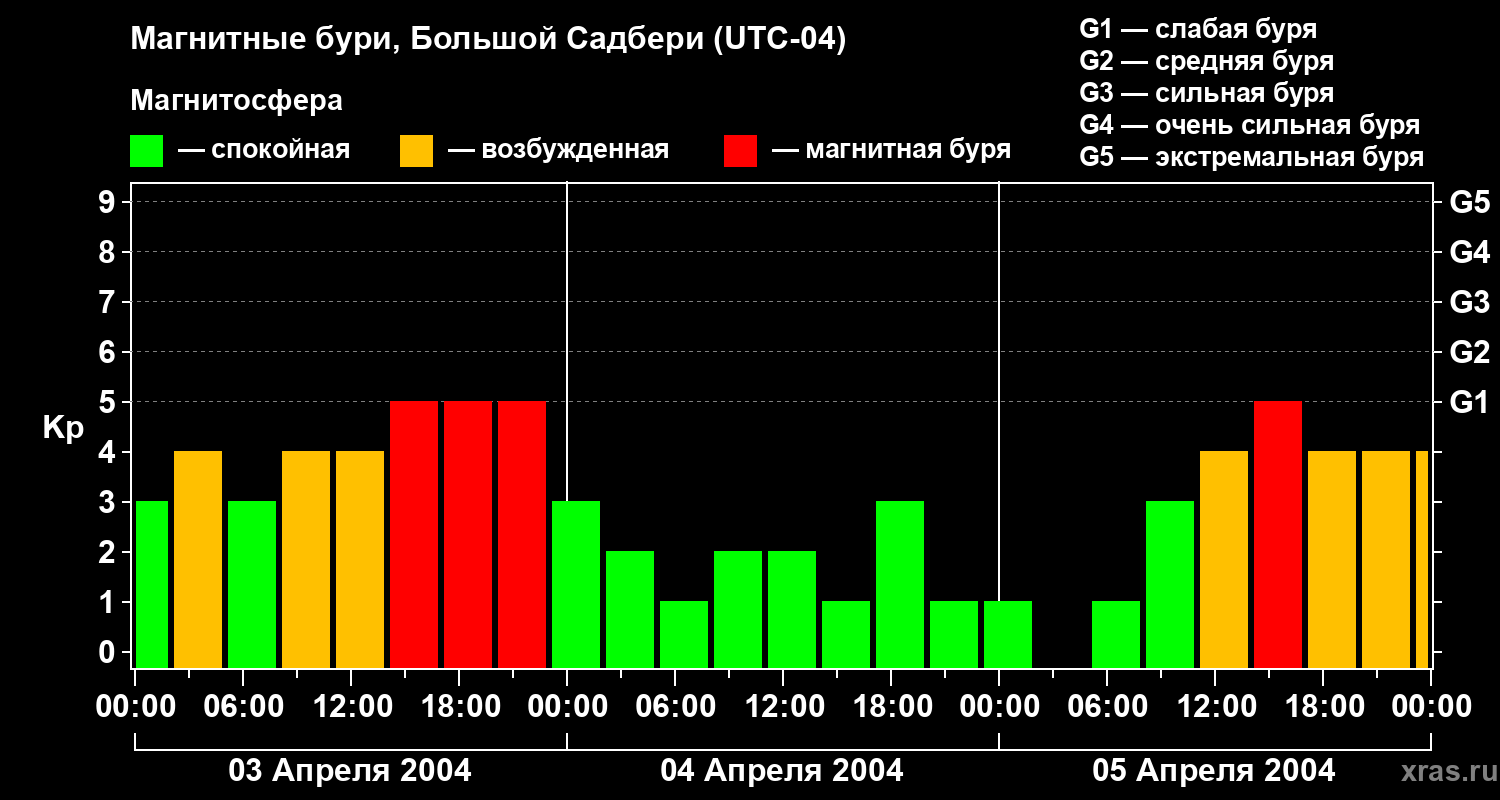 Изменения геомагнитного индекса Kp с 3 по 5 апреля 2004 года для средних широт