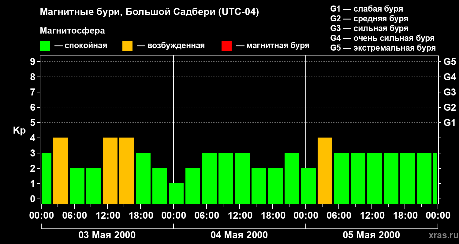 Изменения геомагнитного индекса Kp с 3 по 5 мая 2000 года для средних широт