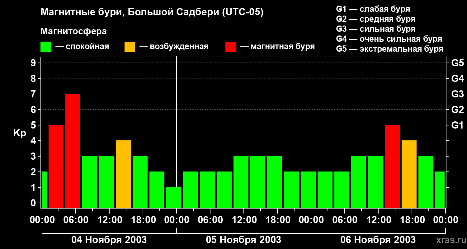 Изменения геомагнитного индекса Kp с 4 по 6 ноября 2003 года для средних широт