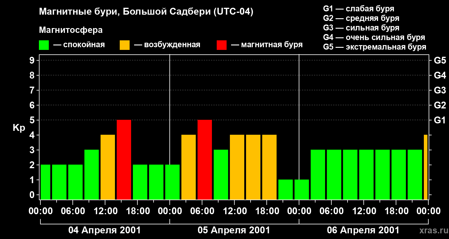 Изменения геомагнитного индекса Kp с 4 по 6 апреля 2001 года для средних широт