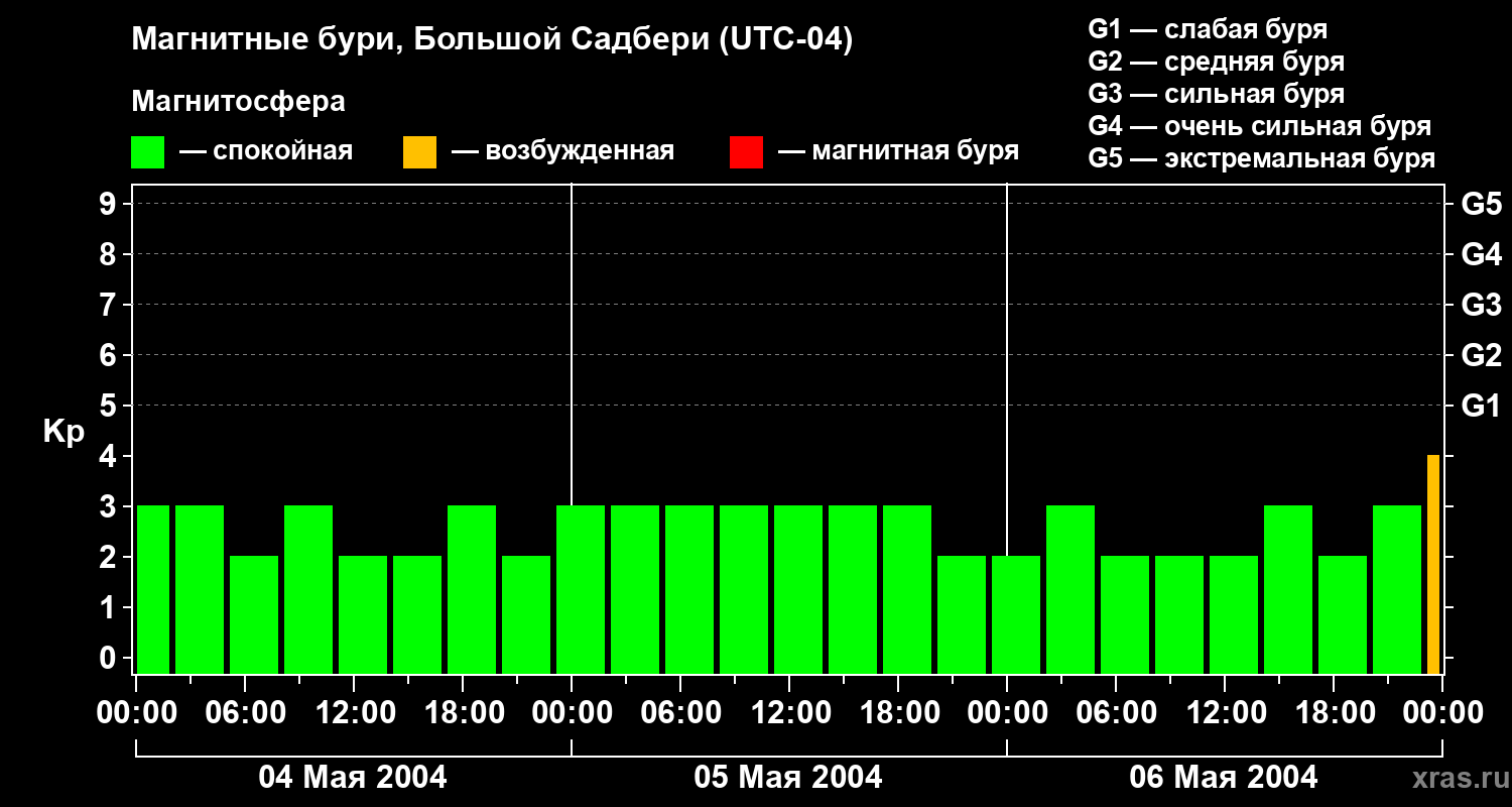 Изменения геомагнитного индекса Kp с 4 по 6 мая 2004 года для средних широт