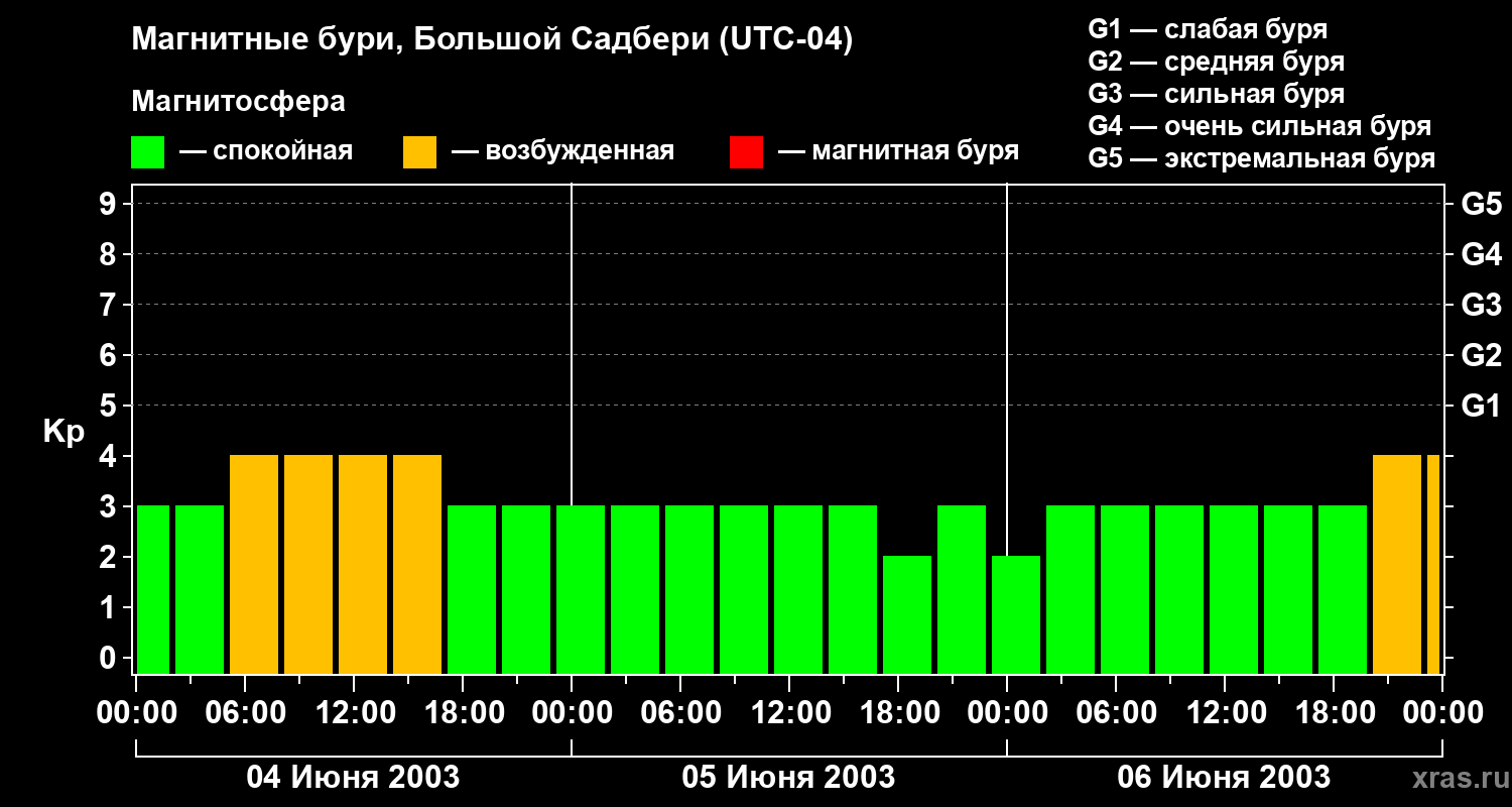 Изменения геомагнитного индекса Kp с 4 по 6 июня 2003 года для средних широт