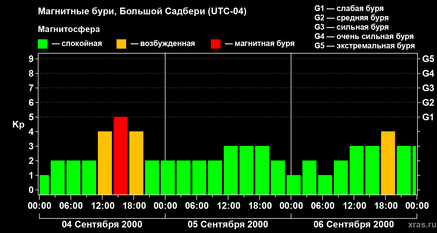 Изменения геомагнитного индекса Kp с 4 по 6 сентября 2000 года для средних широт
