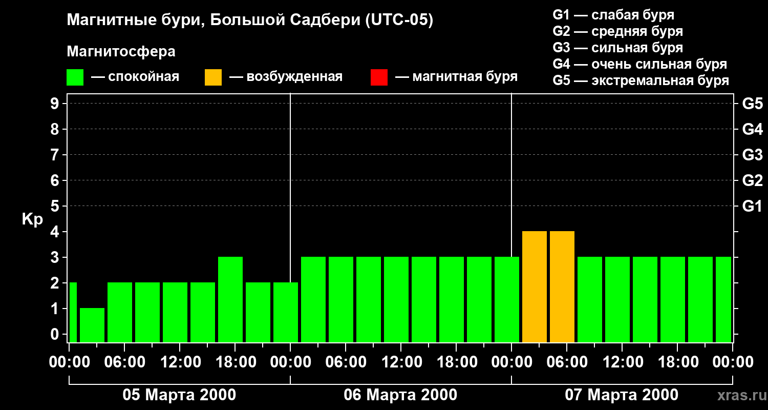 Изменения геомагнитного индекса Kp с 5 по 7 марта 2000 года для средних широт