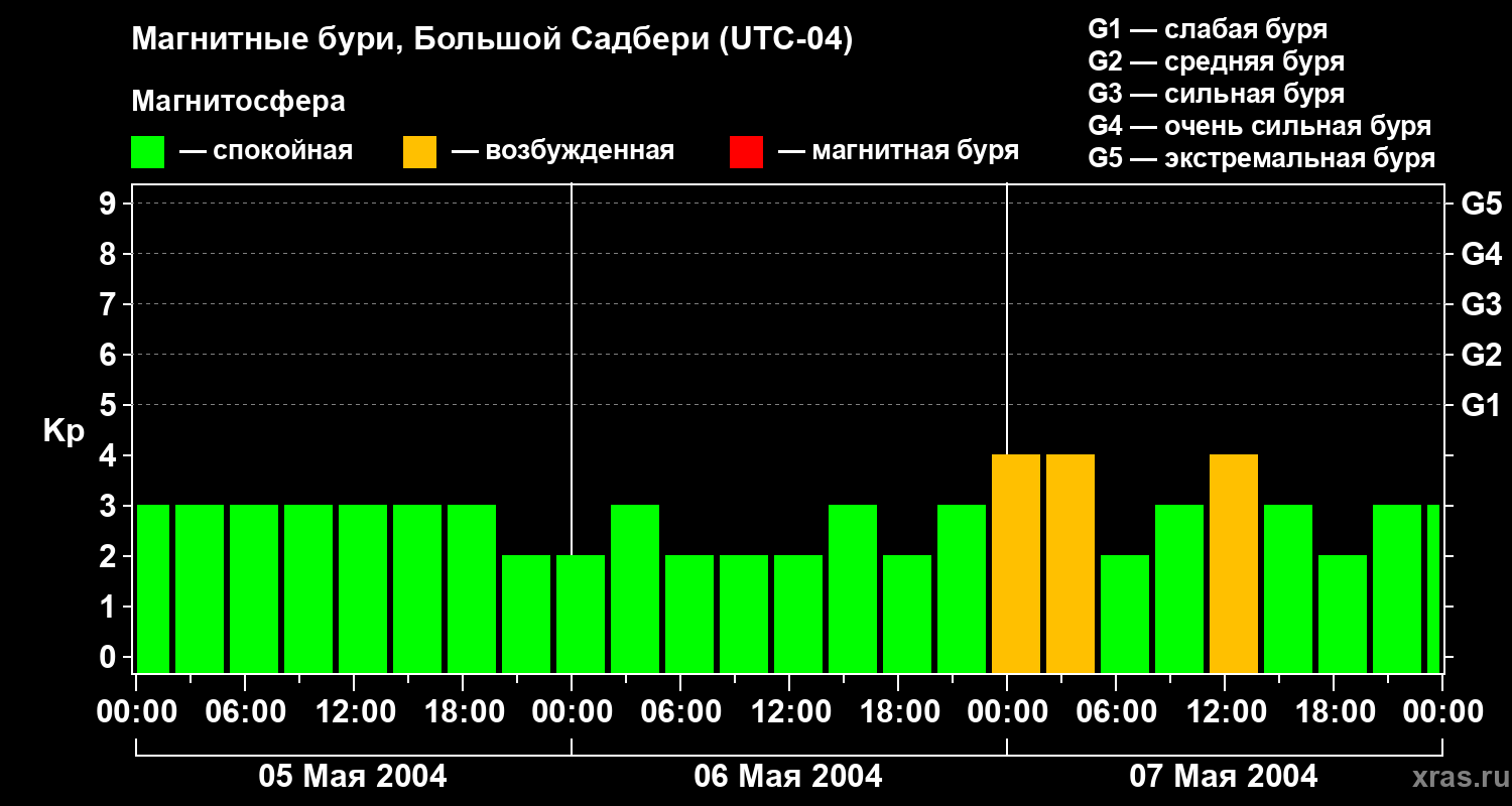 Изменения геомагнитного индекса Kp с 5 по 7 мая 2004 года для средних широт