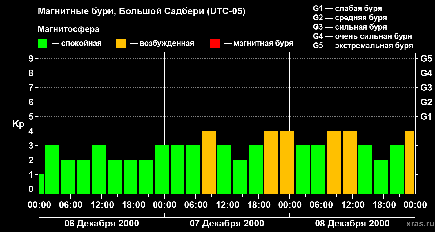 Изменения геомагнитного индекса Kp с 6 по 8 декабря 2000 года для средних широт
