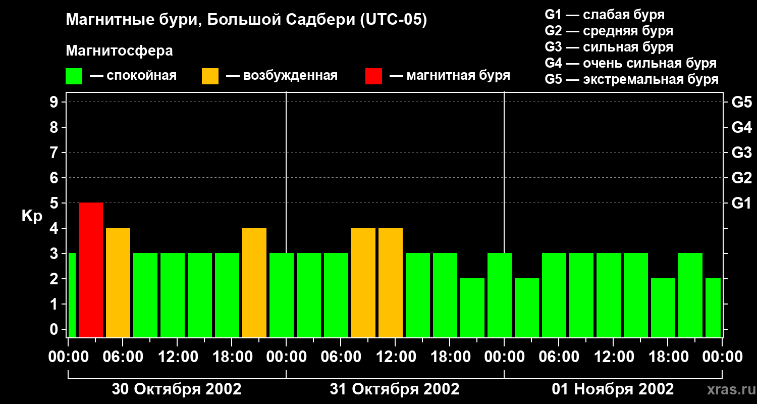 Изменения геомагнитного индекса Kp с 30 октября по 1 ноября 2002 года для средних широт