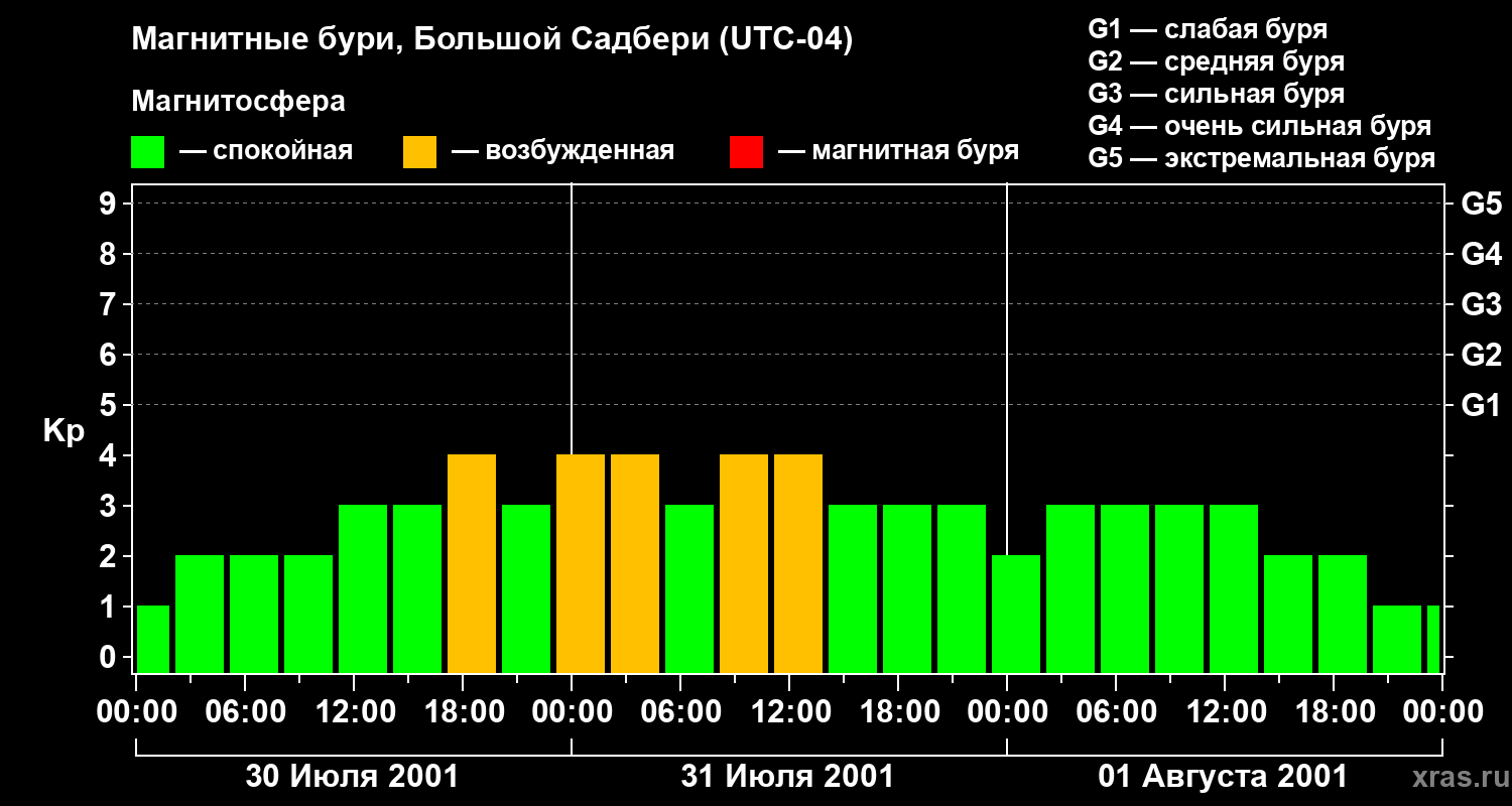 Изменения геомагнитного индекса Kp с 30 июля по 1 августа 2001 года для средних широт