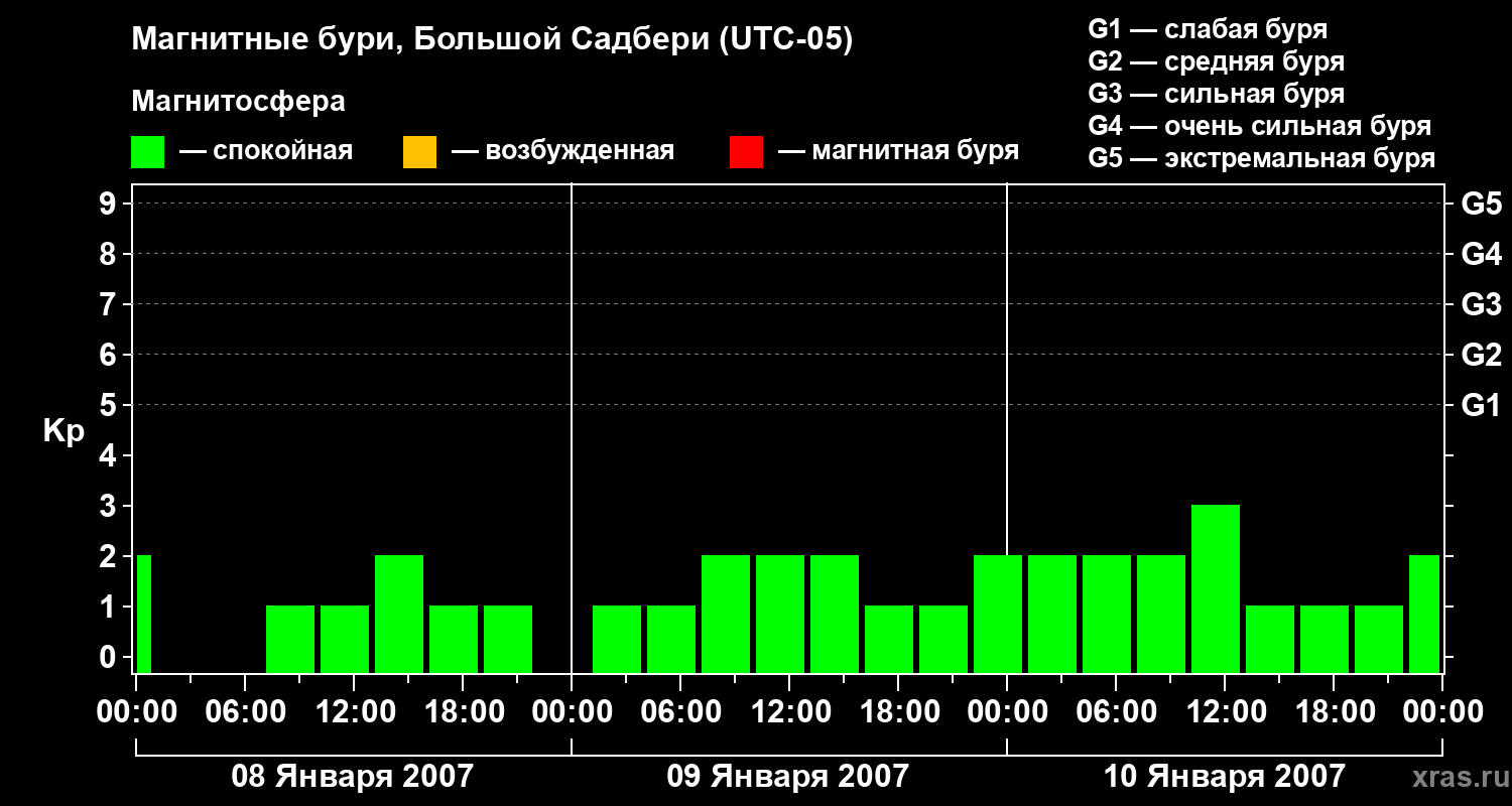 Изменения геомагнитного индекса Kp с 8 по 10 января 2007 года для средних широт